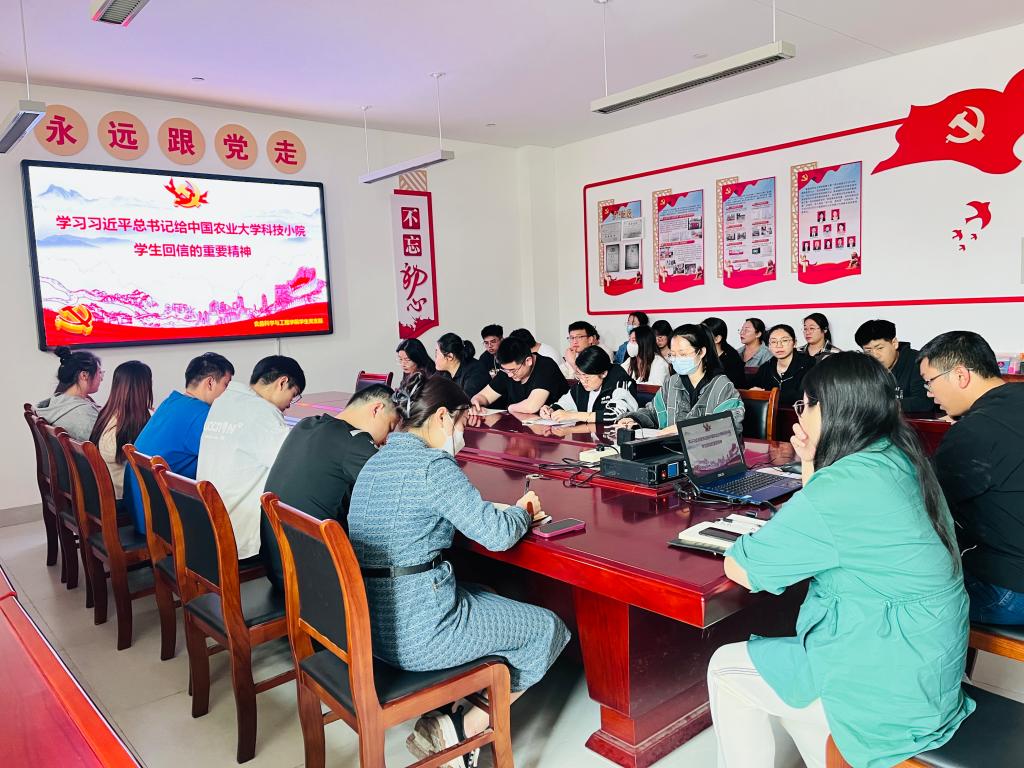 2023年5月9日我院学生党支部召集全体学生党员在淄博校区理工西楼b213室集体学习习近平总书记给中国农业大学科技小院学生的回信。