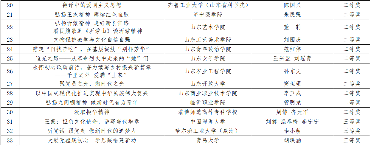 据悉,为充分发挥精品党课的教育引领作用,切实推动“我来讲党课”常态化制度化,根据省委组织部《关于“发现榜样”“我和我的支部”“我来讲党课”三项党员教育活动的通知》和《中共山东省委教育工委关于开展2023年全省高校“精品党课”评选活动的通知》(鲁教工委函〔2023〕28号)要求,经各高校推荐申报、专家评审等环节,评选出优秀“精品党课”60部,其中一等奖10部、二等奖20部、三等奖30部。