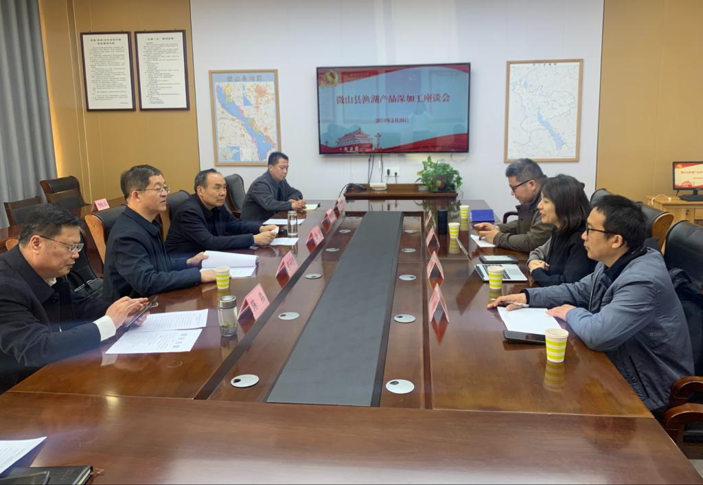 为深入推进我院科研及科技成果转化,助力必赢绿色农业工程创新发展。3月20日,我院“绿色畜产品加工与品质控制创新团队”负责人于洋带领团队科研人员一行四人赴济宁市微山县进行调研。济宁市农业农村局副局长张同法、人大常委会副主任徐霆、县委副书记胡忠华、县农业农村局局长陈淼等一行陪同团队人员,调研湖产品深加工龙头企业。