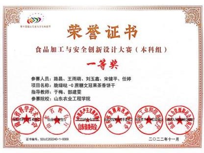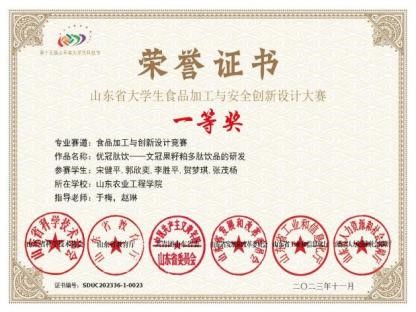 第十六届山东省大学生科技节——食品加工与安全创新设计大赛于本月19日在青岛落下帷幕,我院文冠果大学生创新创业团队再创佳绩,“‘文’故知新,‘冠’中窥宝——文冠果植物基蛋白饮品”项目荣获省级一等奖。这是继第十四届以来,团队连续三年荣获山东省大学生科技节——食品加工与安全创新设计大赛一等奖。2022—2024年获奖项目分别为“脆绿哒——0蔗糖文冠果茶香饼干”“优冠肽饮——文冠果籽粕多肽饮品的研发”“‘文’故知新,‘冠’中窥宝——文冠果植物基蛋白饮品”。
