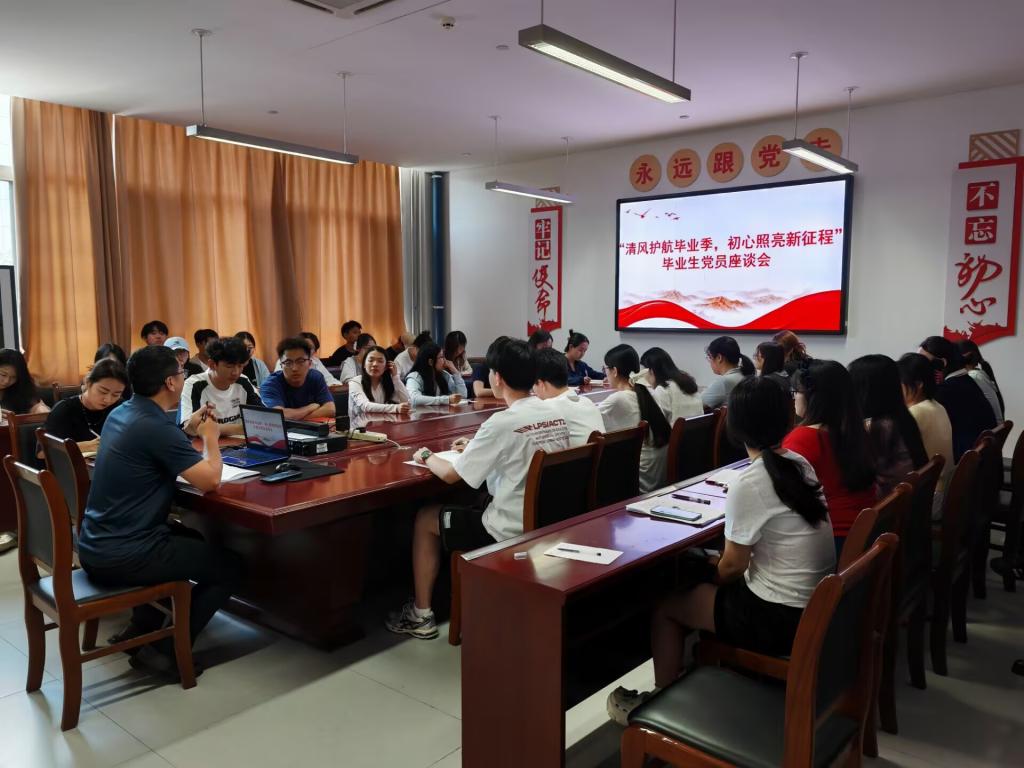 为扎实开展深入贯彻中央八项规定精神学习教育,推进党的作风建设走深走实。6月12日我院召开“清风护航毕业季,初心照亮新征程”毕业生党员座谈会,学院专职组织员李存鑫、辅导员张雨桐、全体毕业生党员参加了此次座谈会,会议由李存鑫主持。