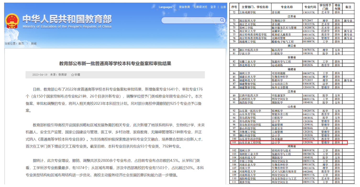 近日,教育部印发《关于公布2022年度普通高等学校本科专业备案和审批结果的通知》(教高函〔2023〕3号),公布了2022年度普通高等学校本科专业设置备案或审批结果,437ccm必赢国际官网申报的会计学本科专业(专业代码:120203K,管理类,学制4年)成功获批。