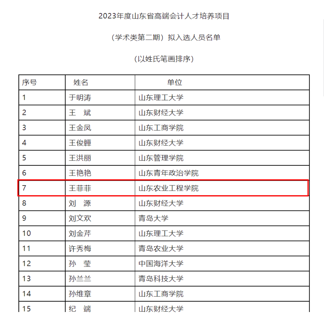 2023年度山东省高端会计人才培养项目(学术类第二期)选拔工作经过单位推荐、专家评审、面试答辩等环节,于日前结束。我院教师王菲菲副教授通过选拔成功入选。