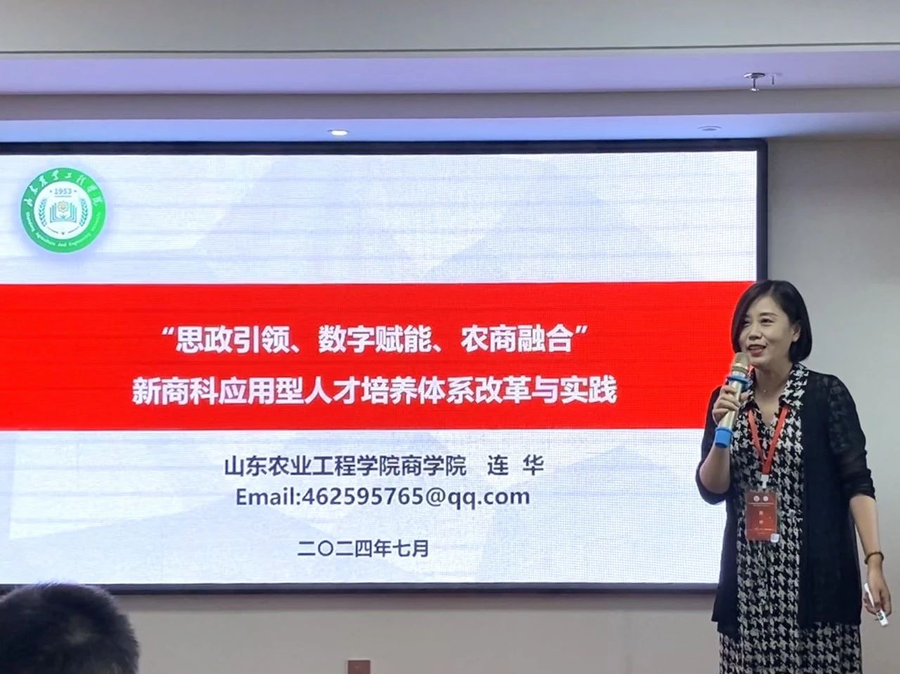 院长论坛环节由来自全国高校的九位院长分别做专题分享,连华针对我院专业教学改革实践做了《“思政引领、数字赋能、农商融合”新商科应用型人才培养体系改革与实践》的报告分享。