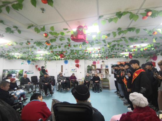 寒风萧瑟,赶走了落叶,可削减不了我们的热情,也停不住我们敬老爱老志愿服务行动的步伐。喜迎冬至,我们为老人们包水饺、送温暖,老人们绽放了慈祥的笑容;忆往昔经典,我们合唱他们耳熟的歌,老人们露出肯定和赞许的神色;展现青春活力,成员们展示舞姿,让他们感受到青年的朝气;拉近岁月的感情,成员们热情的和老人们聊天,畅谈他们往昔的美好,老人们的笑容更加灿烂。整个养老院里洋溢着欢乐祥和的气氛,使老人们感受到浓浓的呵护与关爱,也使参加活动的志愿者接受到一次传统美德教育,强化了对老人尊敬关爱的意识。