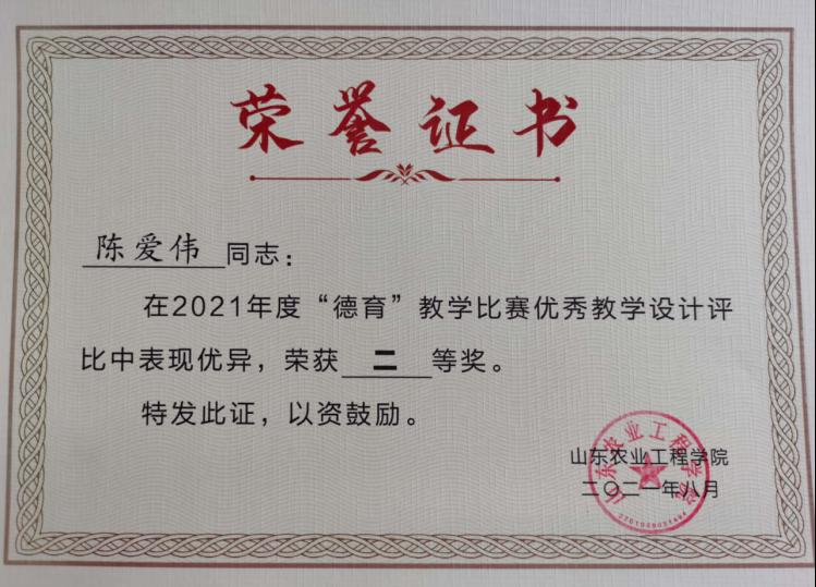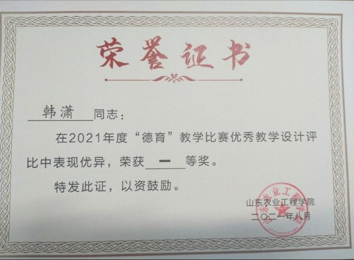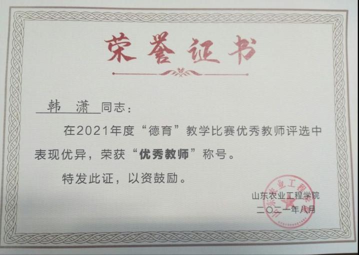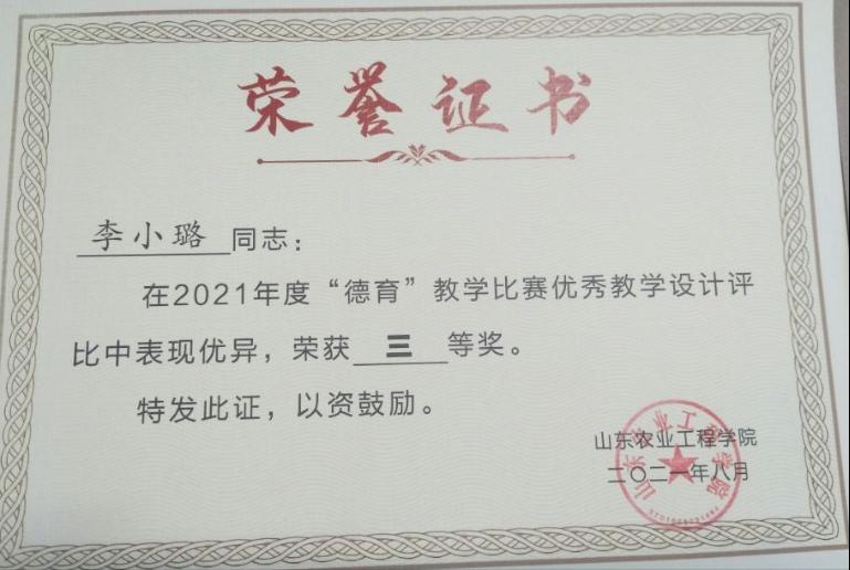 为深入贯彻落实党的教育方针、落实立德树人根本任务,将社会主义核心价值观融入教育教学全过程,把德育元素融入全部课程,使每门课程都“守好一段渠,种好责任田”,让课堂真正成为“传道、授业、解惑”的育人阵地,学校举办了2021年“德育”教学比赛。商学院三位教师、班主任在“德育”教学比赛荣获佳绩:青年教师韩潇荣获“优秀教师”称号并获得优秀教学设计一等奖,陈爱伟和李小璐分别获得“德育”教学比赛优秀教学设计二等奖和三等奖。