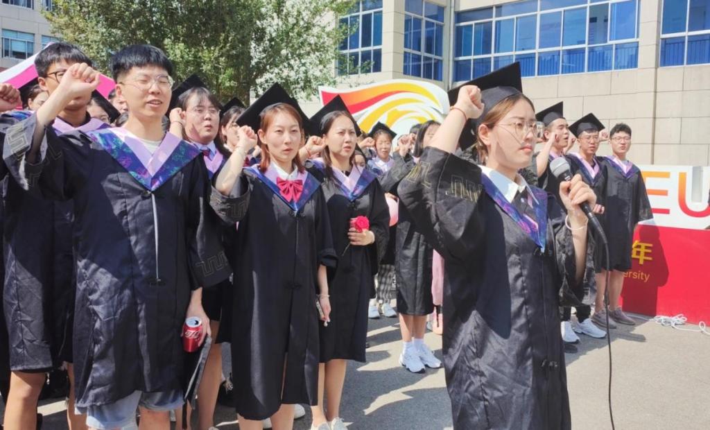 在毕业宣誓环节,全体毕业生在优秀学生代表的带领下,集体宣读毕业誓词。“明德弘商,志存高远;追求卓越,敢为人先;守信重诺,尚中贵和;遵规守纪,廉洁自律;勇毅前行,踔厉分发;以梦为马,不负韶华!”铿锵有力的声音,是青春的誓言,更是勇担使命的承诺,吹响了奋斗前进的号角。