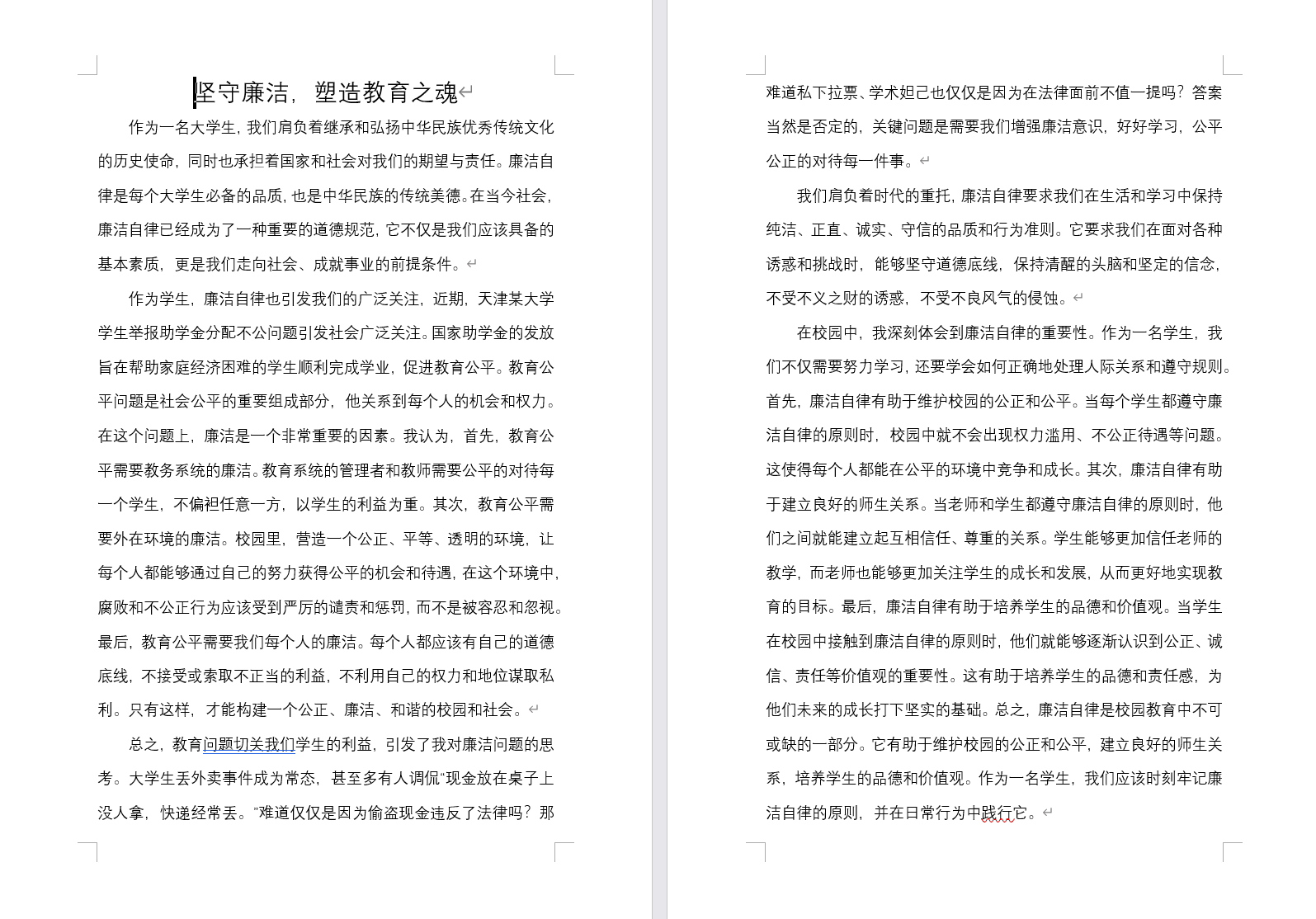 廉洁教育对于大学生重要至极,廉洁修身是高校高质量发展之需,也是大学生自身的成长之需;是中华民族的精神之需,也是国际竞争的国家之需,更是时代发展的大势之需。促进高校加强廉洁文化建设具有重要意义,不仅培养大学生正确的价值观,还提升其自身修养,对促进高校大学生自身成长发展更具有重大意义。