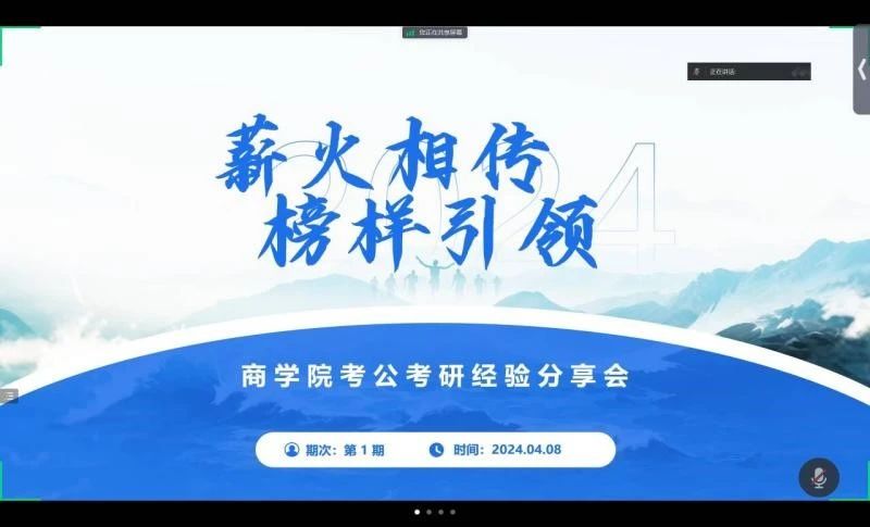 为了助力学弟学妹们明确考研、考公的方向,激发学习热情,商学院于2024年4月8日隆重举办了第一期“薪火相传,榜样引领”考公考研经验分享会。此次线上经验分享会聚焦公务员考试,特邀2020级财务管理2班的冯建发学长和黄世昌学长,为同学们分享他们的宝贵经验。