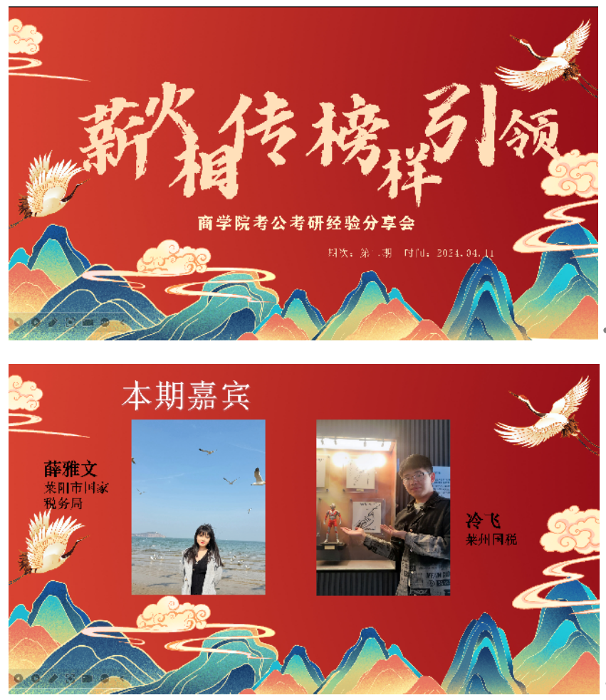 为营造优良学风,帮助低年级同学明确学习目标,树立备考信心,更深入地了解公务员考试政策与备考技巧,做好公考路上的“传帮带”,商学院于2024年4月11日隆重举办了第二期“薪火相传,榜样引领”考公考研经验分享会。此次线上经验分享会特邀2020级财务管理3班的薛雅文学姐和2020级财务管理1班冷飞学长,为同学们分享他们的公考经验。