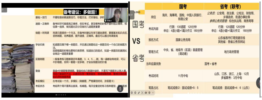 冷飞学长则主要从岗位选择和学习技巧两个方面进行了分享。他简要讲解了岗位选择的重要性,详细的介绍了各类题型的做题技巧并推荐相关老师和书籍。