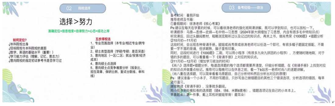 黄文静学姐以院校准备、初试准备和复试为核心,进行了全面而深入的讲解。她以富有洞见的观点,向同学们传授了成功的秘诀:“准确定位自身能力、精准进行信息检索、保持自律不懈努力,以及维持良好心态,这四大要素相结合,便是通往成功上岸的金钥匙。”紧接着,黄文静学姐结合自己的备考经历,分享了她在应对不同考试科目时的宝贵经验。她细致入微地描述了备考过程中遇到的各种挑战和困难,以及如何逐一克服这些障碍,从而取得了优异的成绩。同时,她还向大家推荐了一系列优质的备考课程,帮助同学们更加高效地备考。