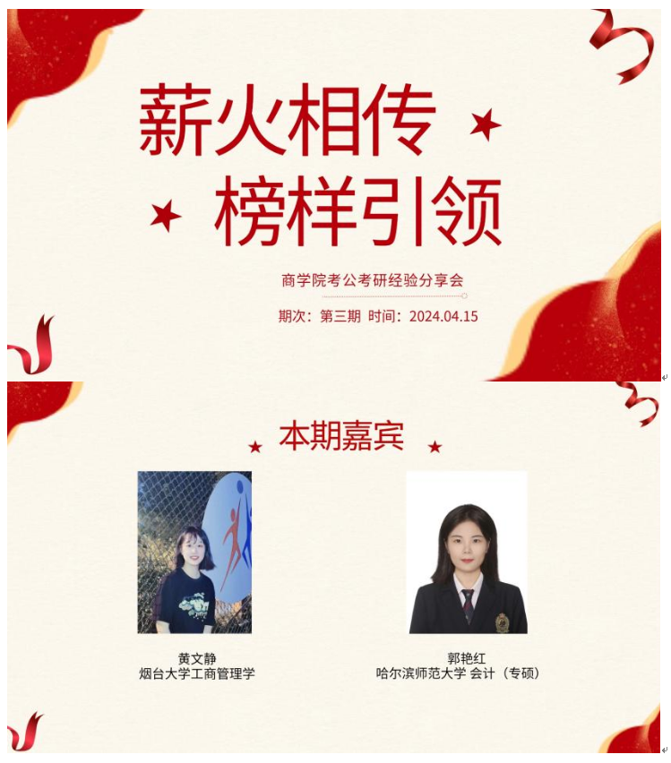 为加强学弟学妹们对考研相关知识的了解,助力明确考研方向,营造积极向上的学风,商学院于2024年4月15日举办了第三期“薪火相传,榜样引领”考公考研经验分享会。此次线上经验分享会聚焦研究生考试,特邀2020级财务管理1班的郭艳红学姐和2020级财务管理3班黄文静学姐,为同学们分享她们的宝贵经验。