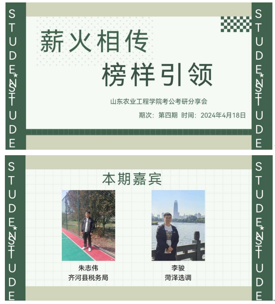 为助力同学们深入了解公务员考试,提高备考水平,助力同学们通过考试实现梦想。商学院在2024年4月18日举办了第四期“薪火相传,榜样引领”考公考研经验分享会。此次线上经验分享会,我们以公务员考试为焦点,特别邀请了2020级财务管理1班朱志伟学长和2020级审计学1班李骏学长为大家带来他们宝贵的考公经验和心路历程。