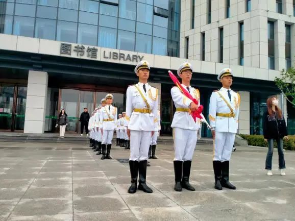 清晨七时整,校国旗护卫队迈着铿锵有力的步伐,怀着崇高的敬意整齐划一地将鲜艳的五星红旗护送至升旗台。伴着庄严的国歌声,五星红旗冉冉升起,迎风飘扬。各学院同学肃立,向国旗行注目礼。