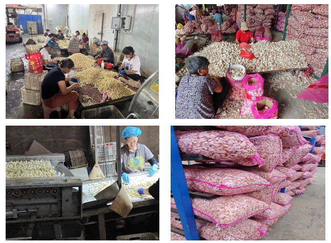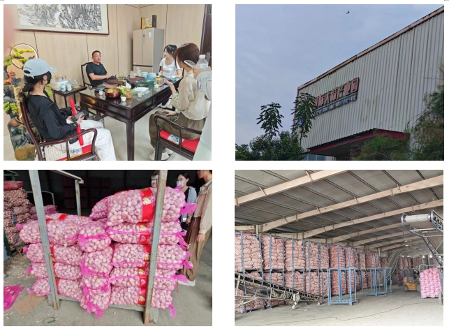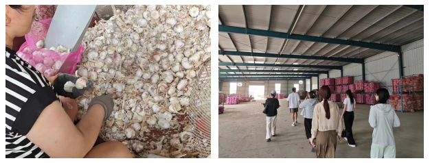 在工作人员的带领下,团队成员参观了不同种类大蒜的存储仓库,包括精加工大蒜的仓库和粗加工大蒜的仓库,据工作人员介绍,不同的国家对大蒜的要求也有所不同,比如印度尼西亚等国家对粗加工的大蒜需求较大,而欧美地区的国家则是更喜欢精加工的大蒜。在这里,还观察到了大蒜的分级、包装和运输过程这些都对团队全面了解大蒜市场提供了重要参考。