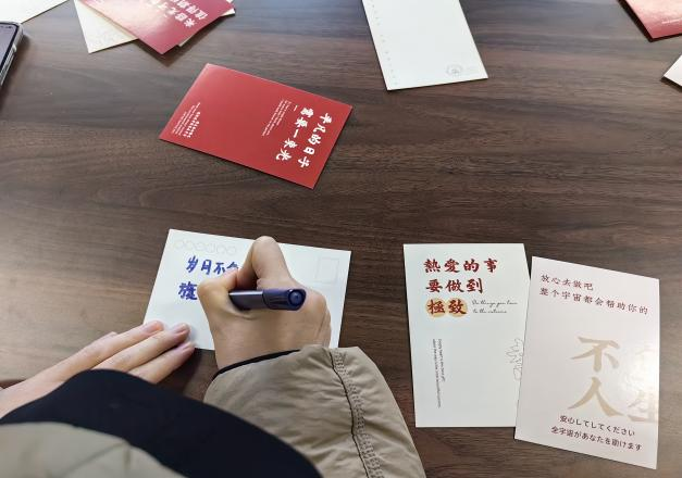 活动中,老师们亲手制作明信片的方式,为即将踏上考研征程的同学们送上了满载深情厚意的激励话语和真挚祝福。一句句诸如“岁月不负少年志,旗开得胜终有时”“以梦为马,不负韶华”“心怀梦想,脚踏实地”“心有所期,定有所成”的祝福语,不仅传递了老师们的美好祝愿,更寄托了对考研学子未来的殷切期盼。