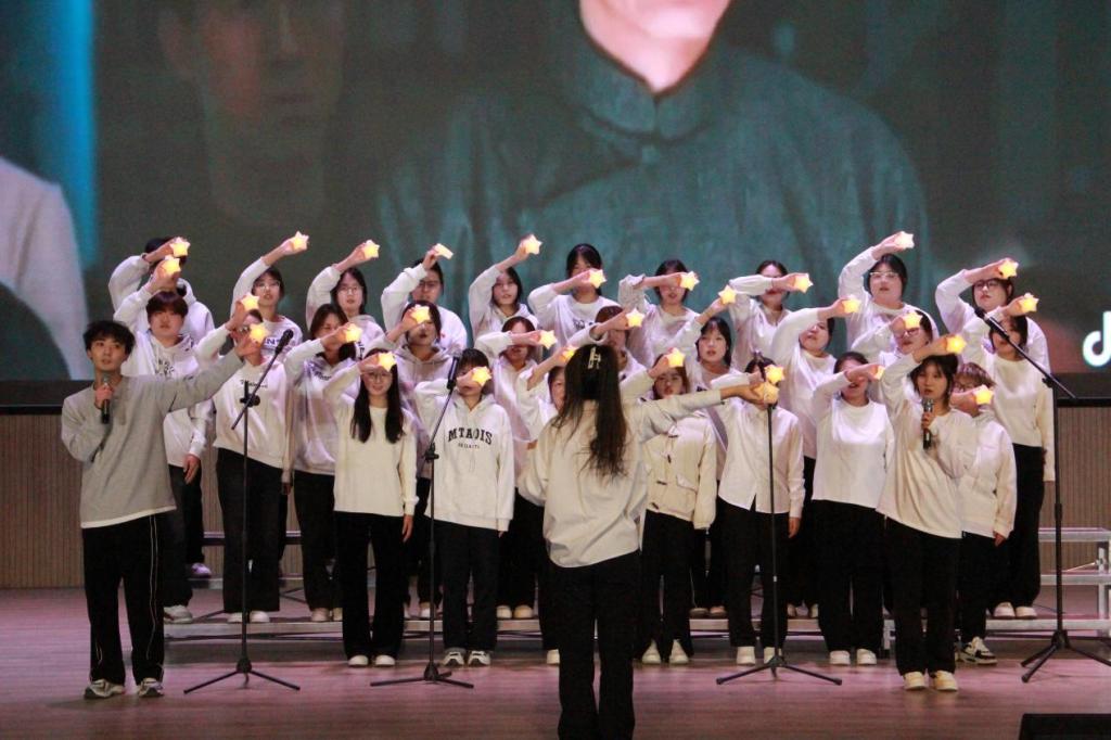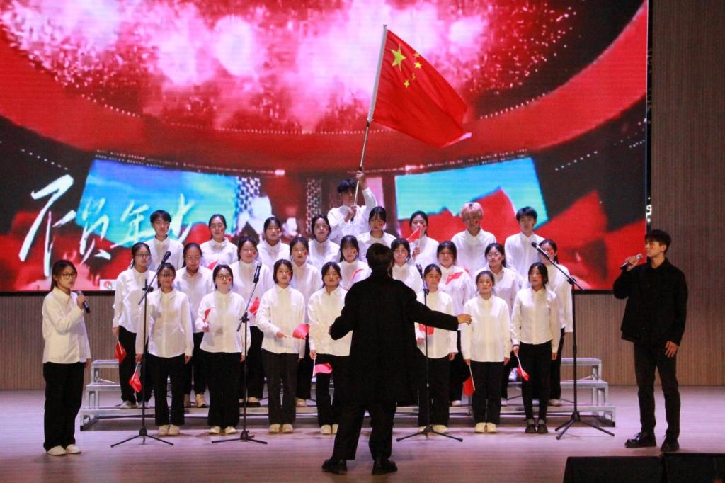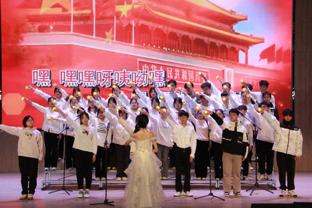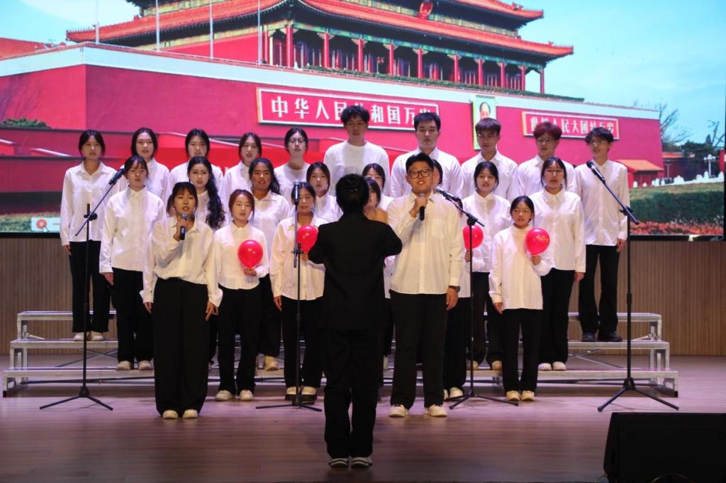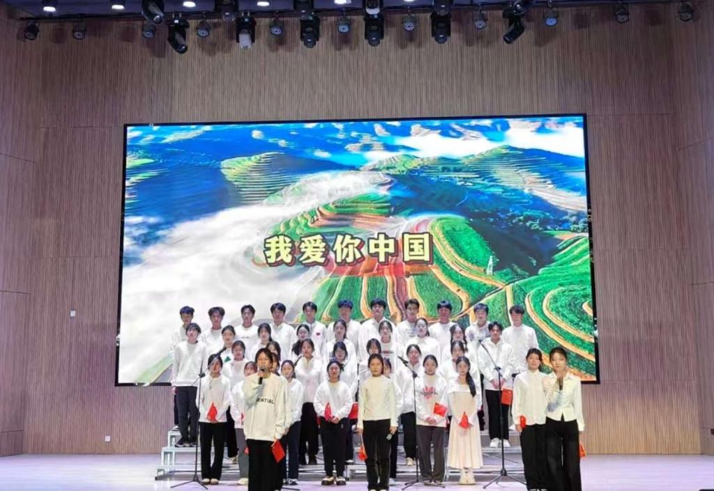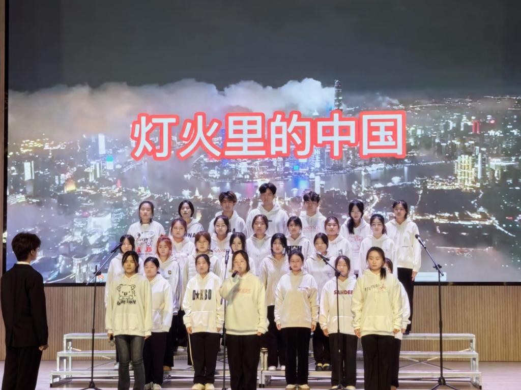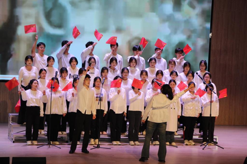 《万疆》和《我们都是追梦人》传递出对祖国山河的热爱和追梦的勇气。《我爱你中国》歌声高亢且饱含深情,一位女同学的灵动舞姿和同学们整齐挥舞国旗成为合唱的亮点。《国家》《我们的时光》《灯火里的中国》《歌唱祖国》歌曲彰显了青年学子立志报效祖国的决心。《错位时空(五四特别版)》以独特的时空交错感在歌声中呈现,红裙女同学舞姿自然,“愿山河无恙 祖国繁荣昌盛”的横幅徐徐展开,彰显了新时代青年的爱国情怀与担当。《紫荆花盛开》合唱创意性十足,演唱的同们学手中的灯光寓意为我国34个省份,以点名的方式来阐明祖国的大好河山寸土不让的决心,三次点名台湾展现出对祖国统一的坚定信念,同学们整齐敬礼后,两位同学挥舞着五星红旗登场,最后同学们齐声喊出“此生无悔入华夏,来世还做中国人!”的铮铮誓言,瞬间点燃全场氛围。《红旗飘飘》和《我和我的祖国》以经典爱国歌曲交织出华美的乐章。《如愿》用优美的歌声表达了对先辈的缅怀与敬意,以及对如今盛世如愿的欣慰。《一起向未来》和《你从未离去》两首歌曲在温情中蕴含着无尽力量。《少年中国说》的合唱同学尽显少年壮志豪情,声音洪亮,诠释着新时代少年的担当。《站起来》的同学们以强烈的节奏感和热情的演唱以及脸上可爱的五星红旗表现出不屈的奥运精神和对祖国的热爱。活动最后,全体参会人员共同唱响《歌唱祖国》,将全场氛围推向高潮,献出商学院对伟大祖国繁荣富强的最美好祝愿。