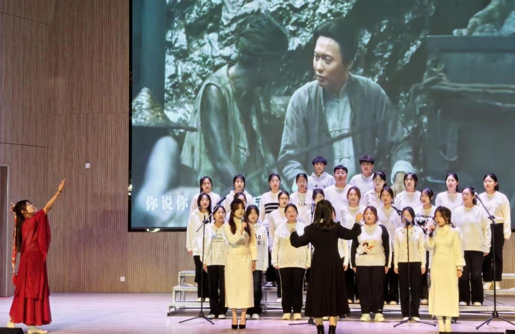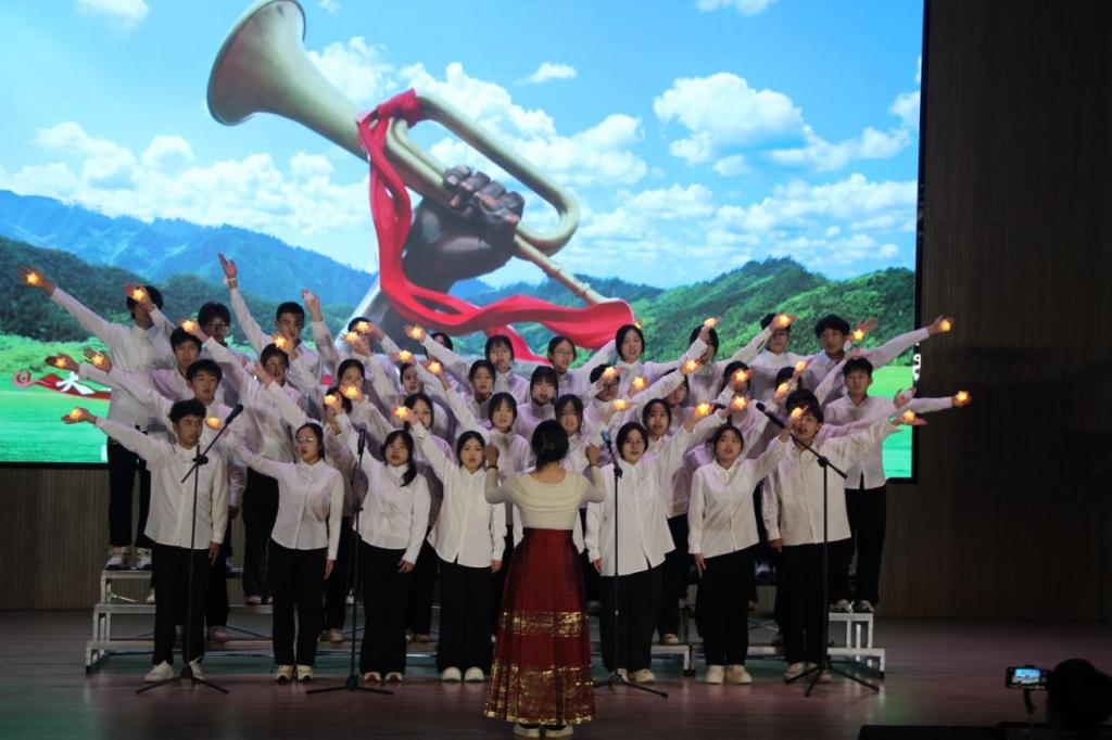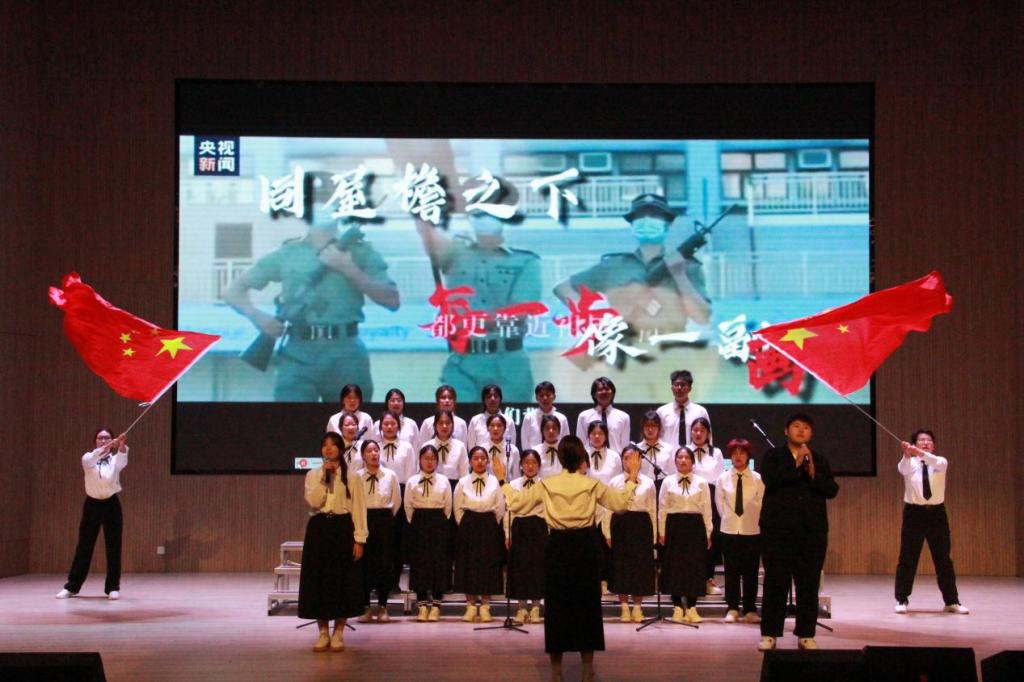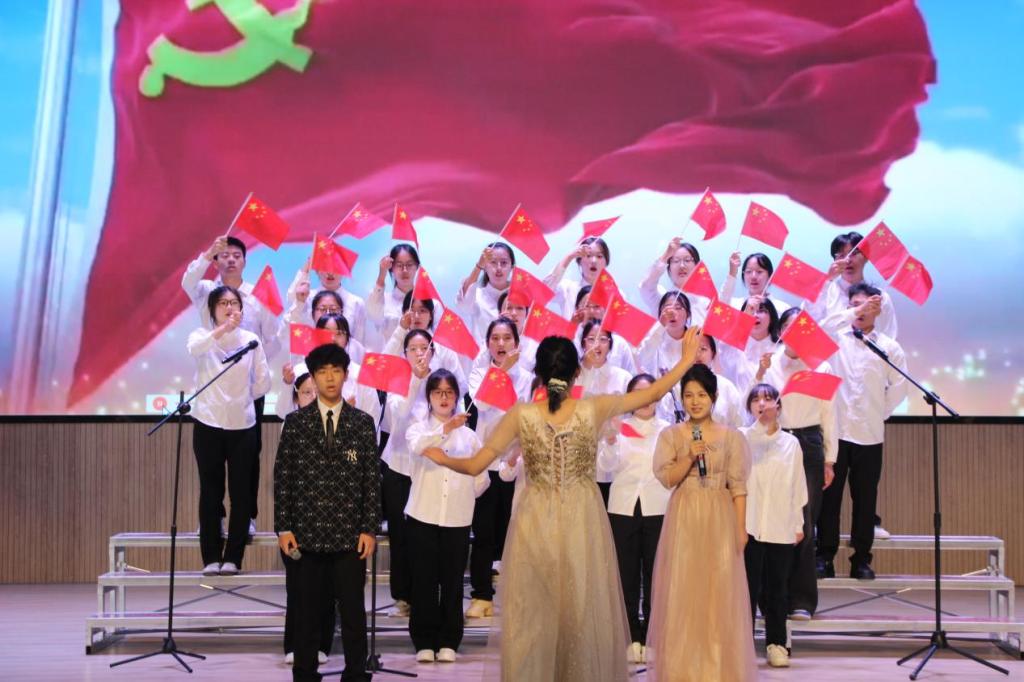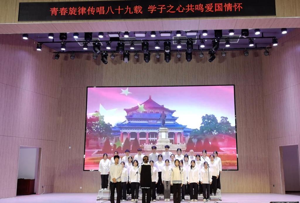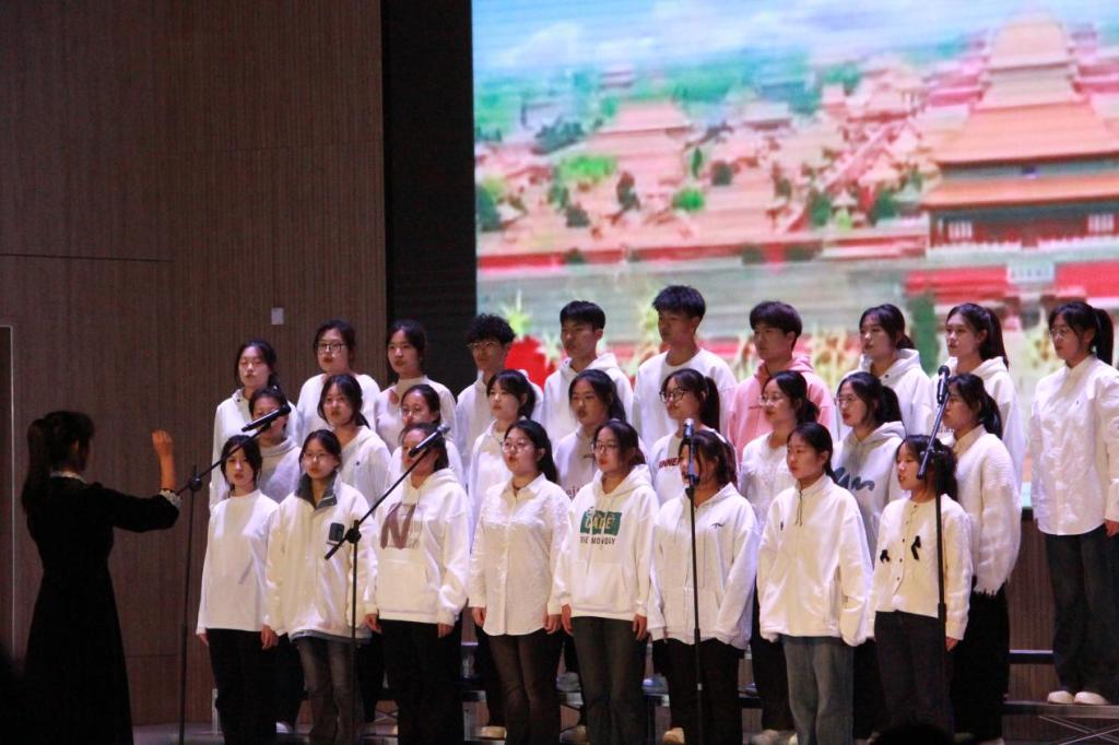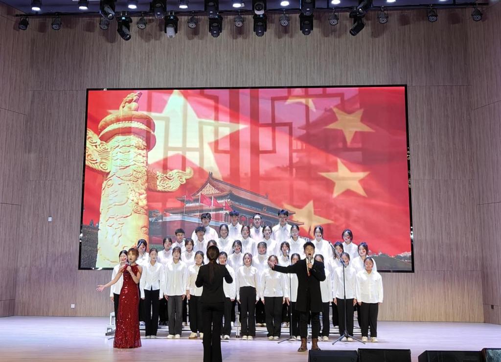 《万疆》和《我们都是追梦人》传递出对祖国山河的热爱和追梦的勇气。《我爱你中国》歌声高亢且饱含深情,一位女同学的灵动舞姿和同学们整齐挥舞国旗成为合唱的亮点。《国家》《我们的时光》《灯火里的中国》《歌唱祖国》歌曲彰显了青年学子立志报效祖国的决心。《错位时空(五四特别版)》以独特的时空交错感在歌声中呈现,红裙女同学舞姿自然,“愿山河无恙 祖国繁荣昌盛”的横幅徐徐展开,彰显了新时代青年的爱国情怀与担当。《紫荆花盛开》合唱创意性十足,演唱的同们学手中的灯光寓意为我国34个省份,以点名的方式来阐明祖国的大好河山寸土不让的决心,三次点名台湾展现出对祖国统一的坚定信念,同学们整齐敬礼后,两位同学挥舞着五星红旗登场,最后同学们齐声喊出“此生无悔入华夏,来世还做中国人!”的铮铮誓言,瞬间点燃全场氛围。《红旗飘飘》和《我和我的祖国》以经典爱国歌曲交织出华美的乐章。《如愿》用优美的歌声表达了对先辈的缅怀与敬意,以及对如今盛世如愿的欣慰。《一起向未来》和《你从未离去》两首歌曲在温情中蕴含着无尽力量。《少年中国说》的合唱同学尽显少年壮志豪情,声音洪亮,诠释着新时代少年的担当。《站起来》的同学们以强烈的节奏感和热情的演唱以及脸上可爱的五星红旗表现出不屈的奥运精神和对祖国的热爱。活动最后,全体参会人员共同唱响《歌唱祖国》,将全场氛围推向高潮,献出商学院对伟大祖国繁荣富强的最美好祝愿。