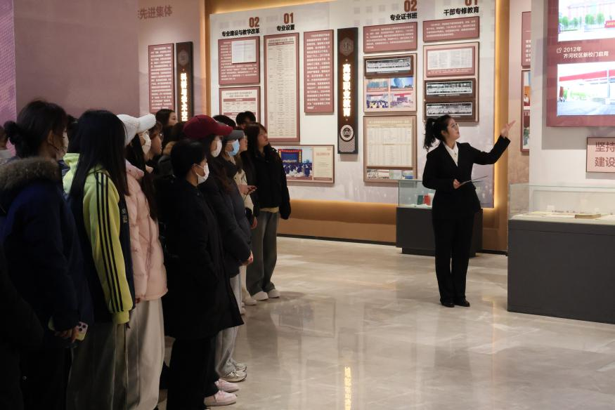 在校史馆讲解员的引导下,青马学员们依次参观了学校改建历史、学科专业建设、学校获得的荣誉以及师资队伍等多个展区。从学校艰难起步到不断发展壮大的改建历程,从重点学科的开拓到专业领域的深耕细作,从熠熠生辉的荣誉奖项到德才兼备的师资队伍,每一段文字、每一张图片都生动地展现了学校的发展脉络和深厚底蕴。青马学员们认真聆听讲解,不时驻足观看,对学校取得的成就深感自豪。