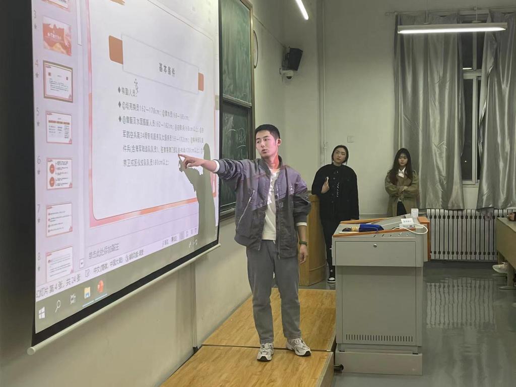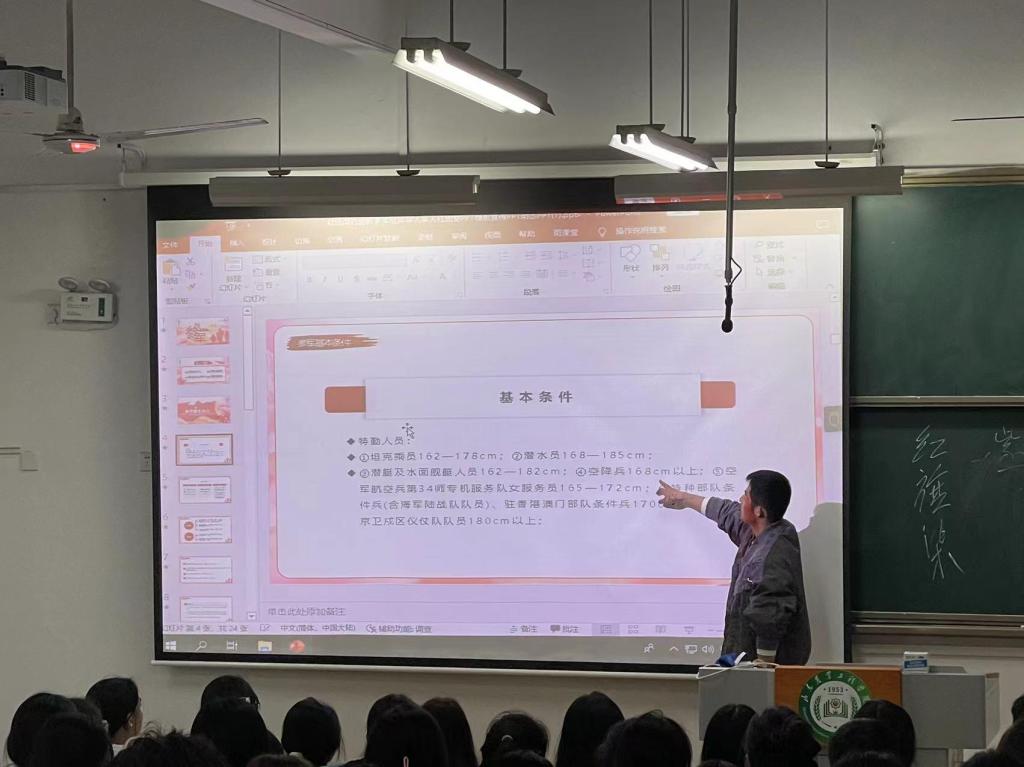 本次讲座由在校退役士兵21级会计1班仲星潭(男)、22审计专升本1班彭雪冉(女),围绕"多彩军营生活"分别讲述了参军入伍流程、优惠政策、退役补贴等相关事宜,鼓励同学们力争到部队去经受锻炼考验,积极应征入伍。