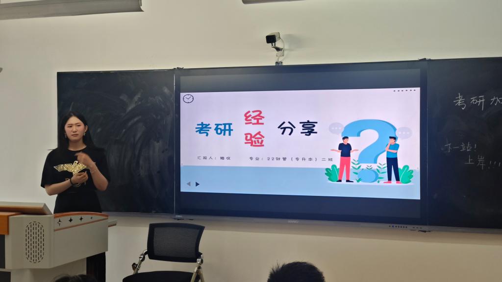 首先进行分享的是2022级财务管理专升本2班的陆仪。陆仪从个人介绍、报考指南、大赛和择业经历、考研备考经验以及关键素质和心路历程五个方面给大家分享了关于求职和求学路上的宝贵经验,提醒大家在考研考公之前一定要提早布局谋划,找对学习方法,相信重复是成功之母。另外,选择一定是大于努力的,它会让你避免无用功和事后痛苦,通过分析自己的优劣势找准适合自己的道路,多方面拓展自己的职业发展道路。最后,她语重心长地告诉学弟学妹,人生没有几次可以转折的点,所以一定要坚持到底,只有拼尽全力才会不留遗憾,你真正的对手绝对不是现在一起学习的这些,而是坐在考场上的那些,所以请相信努力过后的自己潜力是无限的,那些不留余力去沉淀的孩子们到考场上你会感受到什么叫下笔如有神,这个学习过程才是最值得怀念的!她想把人生的座右铭分享给大家:我相信因果,是相信我们在“因”上努力,在“果”上随缘。
