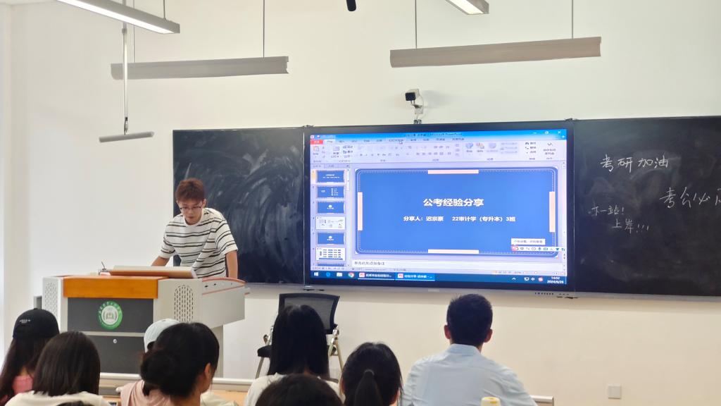 他的分享主要分为自我定位、公考经验分享两大板块。在自我定位篇,建议学弟学妹一定不要盲目从众,寻找属于自己的赛道,做好职业规划。在公考经验分享篇。主要从明确目标、考情分析、时间安排、各模块经验分享、选岗建议以及面试技巧展开。第一,明确选择国考还是省考。建议学弟学妹冲刺国考,因为国考应届的优势高于省考。第二,考情分析。行测在规定时间拿到最高的分数;申论在规定时间达到最优水平。第三,时间安排。建议学弟学妹按照自己规划合理安排,最好每年6月份之前完成基础学习。第四,模块经验分享。第五。选岗建议(最为重要)①尽量选择自己家乡所在的税务局或其他单位(2024年不提供宿舍)。②男生尽量报限男生的岗位,女生尽量选择不限性别的岗位(只是建议)。③大部分应届毕业生的岗位报录比在15-20:1,远低于全国平均的报录比,选岗的时候一定要注意综合考量。④限2025届毕业生由于应届毕业生。第五。面试技巧。平时多参加演讲以及小组活动,克服怯场。并祝愿学弟学妹能够在明年此时都能得到最好的归宿!