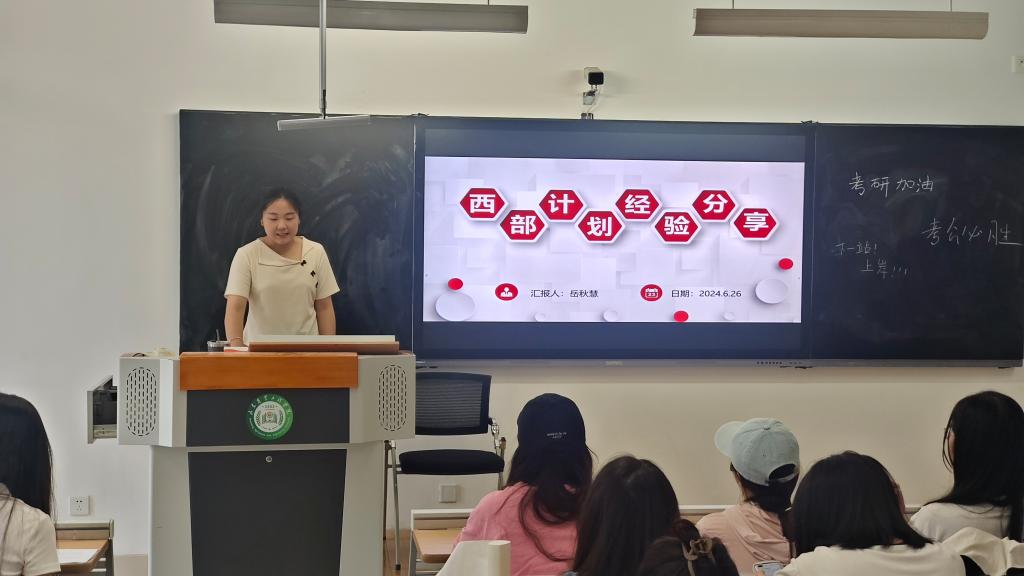 最后进行分享的是2022级审计学专升本2班的岳秋慧同学。作为西部计划的入选者之一,岳秋慧就西部计划是什么、为什么想去、怎么准备三个方面展开交流。在“是什么”上帮助大家打破对西部计划的常规认识,分析了西部计划的服务内容,帮助同学们明确目标、做出选择;学姐从自身出发,讲述了要去的三大理由,在优惠政策上进行了着重分析,帮助同学们更全面地了解西部计划的好处,减少了学生们的一些顾虑;最后,总结了“怎么准备”的全套流程,告诉同学们要目标坚定、保持冷静、平常心对待、真诚应对。最后,学姐寄予期望,西部计划不仅是一段旅程,它是人生中一段难忘的回忆,更是一份责任与担当,欢迎大家加入西部计划大家庭,期待以后的相见。