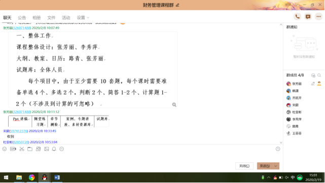 首先,为了更好的进行在线课程准备工作,财务管理课程的老师们展开积极讨论,拟将课程建设成为线上线下结合课程,明确分工,相同课程的老师联合进行资源准备工作,视频、习题、作业、讨论、题库同时进行。