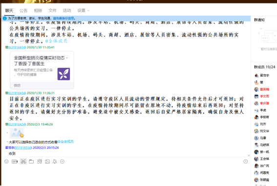 其次,利用各种qq群及时与学生联系。老师们在学生的实习群、班主任在班级群里及时了解情况,鼓励大家相信国家一定能够渡过难关,取得最终胜利。张芳丽老师在网课中组织问卷,调查了解学生学习情况,并建立班委学习反馈群,通过班委及时反馈了解大家的需求。侯国栋老师熬夜制作视频,已经完成课程的1/2视频录制工作。