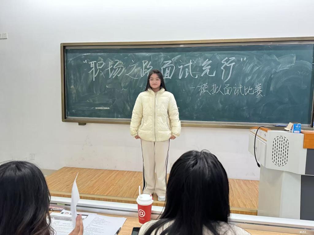 活动当天,参赛学生由学生会志愿者带领有序进行模拟面试,面试过程模拟真实企业招聘流程,包括自我介绍和问题回答两个环节。在自我介绍环节中,各位参赛者以流利的语言进行了自我介绍,通过自我介绍来展示自身优势与目标职业的适配。在问题回答环节时,各位评委轮流对各位参赛者进行相关专业知识、未来规划和工作可能会遇到的困难等方面的问题进行提问,各位参赛者镇定自若、条理清晰、游刃有余的回答了评委的提问。