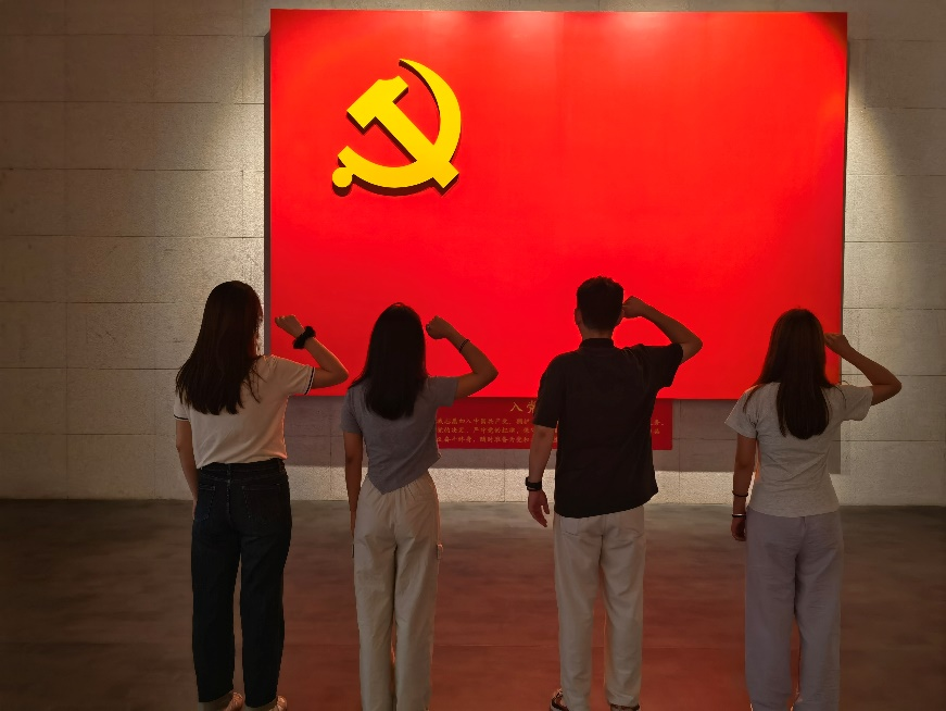 此次纪念馆之行不仅是一次生动的党史教育,更是一场深刻的精神洗礼。团队成员曹冉表示:“在整个参观过程中,我多次被深深触动,眼眶不由自主地湿润了。心中充满了对老一辈革命家的深切敬意和对他们英勇事迹的感动。”成员薛呈祥则感慨道:“回顾那些艰难岁月和辉煌成就,我对未来充满了无限的憧憬和坚定的自信。这些历史的记忆激励我为实现更加美好的明天而努力。”在老革命前辈照片展览厅,团队成员们怀着庄重的心情整齐列队,紧握右拳,面对鲜红的党旗,庄严重温入党誓词,进一步坚定了为党和国家不懈奋斗的决心。