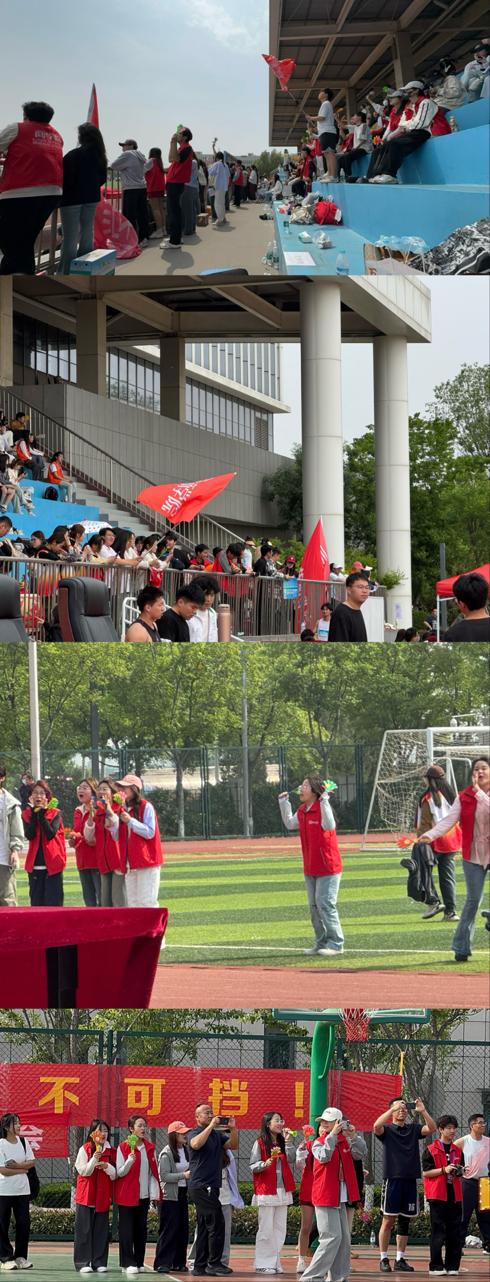 一次次的摆臂,一次次的跨越,皆是青春征程上无畏的冲锋。镜头转向商学院观众台,看台上声浪翻涌,手中的应援棒,小彩旗随着最后的冲刺用力摆动,助威呐喊如浪潮奔涌,尽管面临恶劣天气,雨水狂风也未曾减弱他们对运动员的无限期许与鼓励,炽热的助威化作力量,让整个赛场迸发出蓬勃的青春能量。