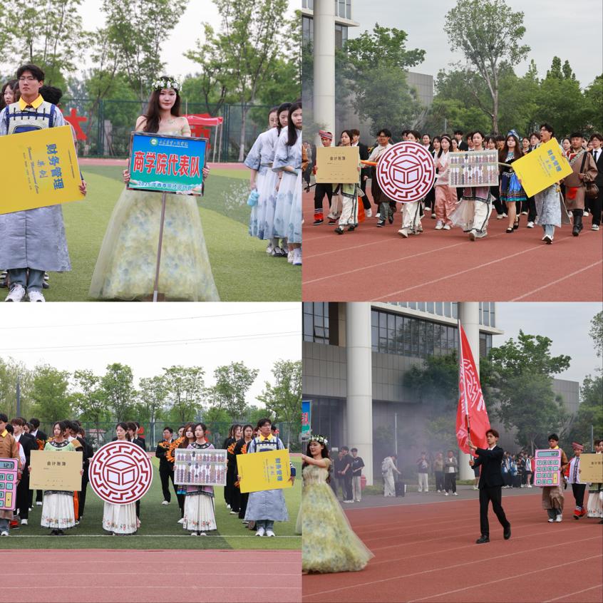 方阵踏歌而来,商韵精彩绽放。开幕式现场,商学院方队由六名队员托举院旗,手中的彩色烟雾,迎着风向高处飘扬,活力四射。后面队员,由身穿各具特色的服饰组成,算盘、财务书本等是商学院的典型标志。身穿正气西装,寓意传承商道智慧,"明德弘商,信达致远"的理念贯穿全院。步伐整齐划一,举起象征生命力的向日葵入场,完美诠释了商院学子的活力与风采。