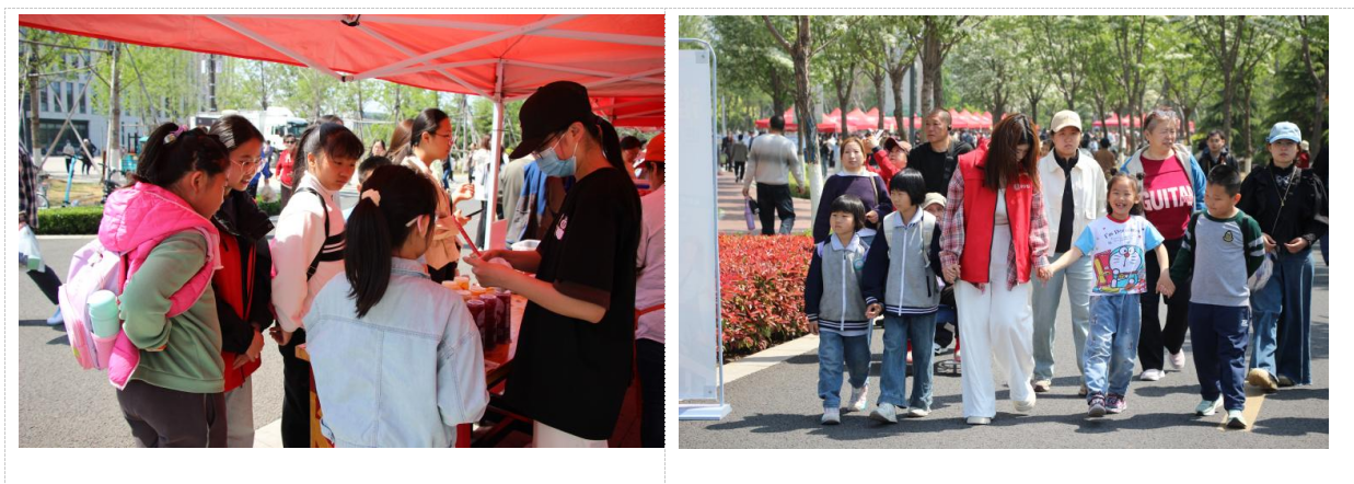 随后,孩子们在志愿者的带领下走出教室,漫步于流苏大道。道路两旁,摊位林立,各式美食香气扑鼻。孩子们品尝了炒锅饼、茶饮、淄博烧烤等特色美食,尽享美食的乐趣。此外,扎染、投壶等多样化的体验活动及DIY项目,更是激发了孩子们的创意与想象力,让他们在游戏中收获快乐与成长。