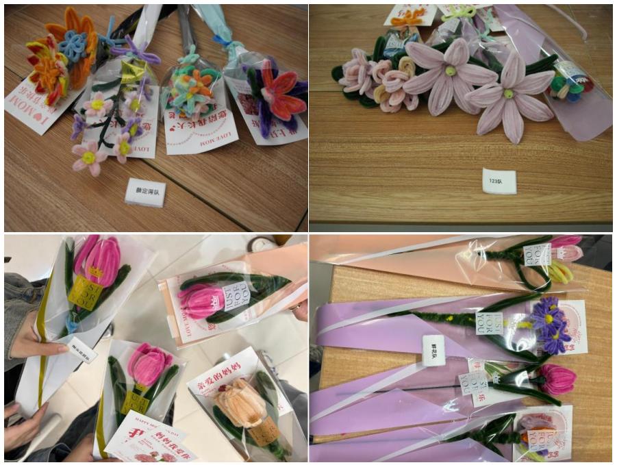 随着最后一片叶片缠绕固定,色彩缤纷的扭扭棒花束在同学们手中绽放。有人制作出精致的单支康乃馨,有人完成了色彩搭配独特的多花组合,大家兴奋地举起作品互相展示,镜头记录下灿烂笑容与创意成果,这份亲手打造的礼物,即将跨越山海,把心意与祝福传递到母亲身边。