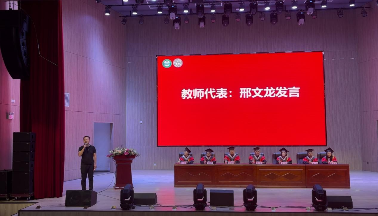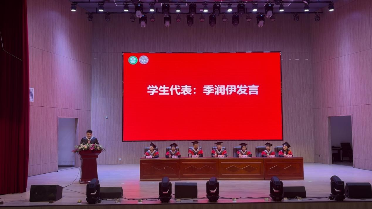 师生寄语环节,教师代表邢文龙老师深情寄语毕业生。他引用领袖寄语,勉励同学们在青春赛道上不懈奋斗,勇攀人生高峰,并深情表示“商学院永远是你们的家”。优秀毕业生代表季润伊同学回顾了在校期间荣获多次奖学金、担任学生干部、参与志愿活动并光荣入党、成功考取选调生的成长经历,代表全体毕业生向母校、师长、家人及同窗表达深切感恩之情,呼吁大家传承商院精神,并送上真挚祝福。
