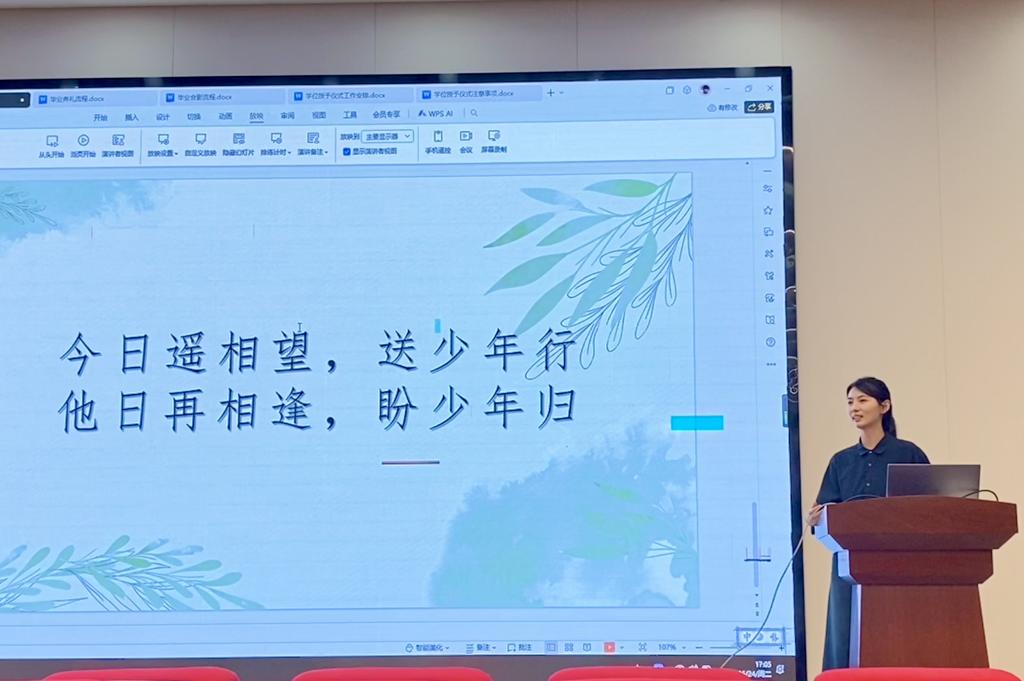 除了事务性安排与安全教育,班会还充满了温情与感动。辅导员们以“且以青春赴山海,轻舟无惧万重山”“今日遥相望,送少年行;他日再相逢,盼少年归”等暖心话语,鼓励毕业生勇敢面对未来挑战,告知同学们母校永远是坚实的港湾。同时,倡议大家保持“空杯心态”,认识到终身学习的重要性。此外,还温馨提醒同学们感谢同窗情谊,定期与父母联系,珍惜班级群的青春回忆,字里行间饱含着对毕业生的深切关怀与美好期许。