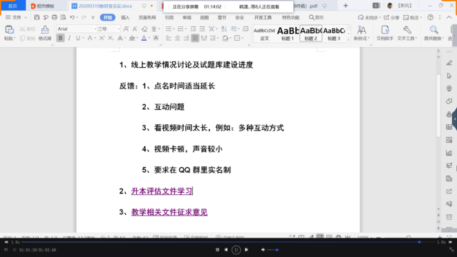 3月10日,我院财务管理教研室召开线上教学工作经验交流会,会议通过QQ群会议平台从本科合格评估、线上教学质量和课程建设等多个角度来对一周以来线上教学工作的开展进行了总结和经验交流。