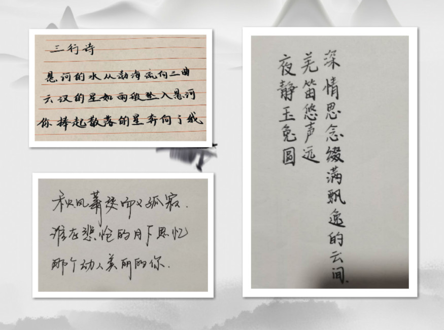 18级会计专业郁美琪运用逆喻的修辞方法,表达出“河水”从渤海逆流到三曲,就像是星星不会掉在地上,而故人也不会身披星光奔向“我”,在圆月团圆之际,更牵出浓浓思念之情;19级会计专业马晴所表达的是在八月桂花香遍校园,仿佛听到羌笛声,一片情思溢满心间,遥望着明月,心怀着故乡,思念着亲人的情感;19级财务管理专业徐文静将秋天和成长联系起来,认为秋天本来就是一个离别,充满悲寂的季节,不断长大的我们往往都会有着成长的惆怅和烦恼,我们在月下寻觅追忆那个梦想中你。那个你,往往就是你所梦寐以求的自己。
