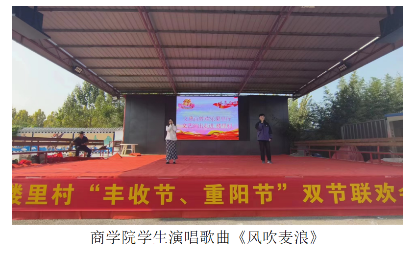 商学院学生带来的歌曲《风吹麦浪》表现了对乡村生活单纯美好情感的留恋,呼唤人们记忆深处那份真纯;歌曲《世间美好与你环环相扣》祝愿于农民的生活更加美好。在活动的最后合唱《我们走在大路上》更歌颂了赞美丰收好年景,更憧憬美好新生活。