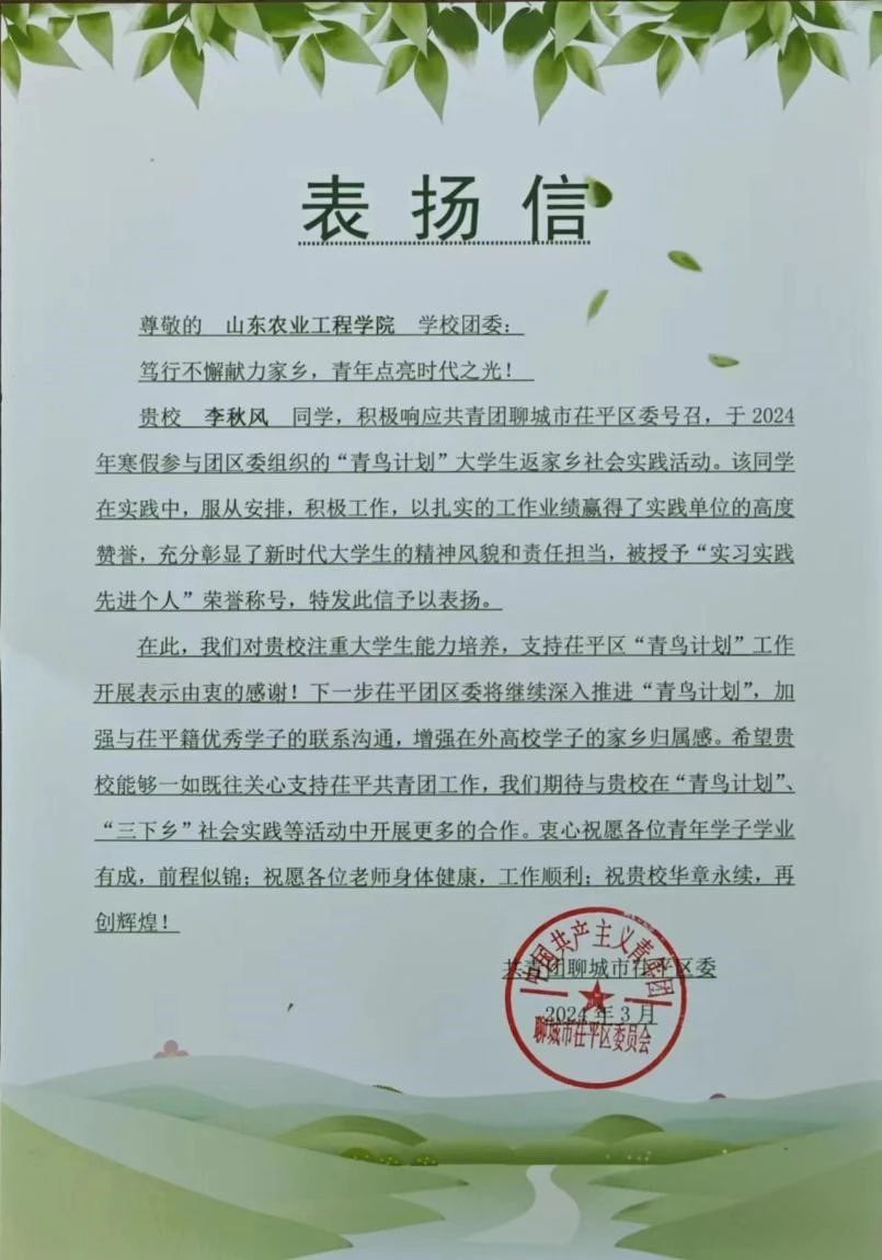 青鸟归巢躬实践,扬帆起航踏新程,为落实共青团中央关于开展大学生“返家乡”社会实践活动有关工作要求,引导广大青年大学生通过实践提升社会化技能,进一步了解家乡、热爱家乡、服务家乡。我院学子积极参与到青鸟计划社会实践之中。近日,我院收到了来自共青团聊城市茌平区委的感谢信,对寒假期间审计学专业学生李秋风参与大学生返家乡社会实践表现提出表扬。
