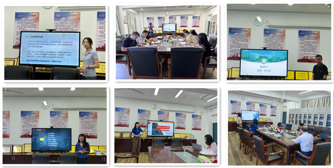本次说课研讨活动分教研室进行,12位教师对《中级财务会》《审计学》《财务管理》等13门课程进行说课。各教研室成员参与听评说课。说课教师以人才培养方案和课程教学大纲为依据,从各自课程的教学设计、教学内容、教学方法、考核方案等方面进行了详细的介绍和说明。说课、试讲材料准备充分,课堂教学目标明确,教学思路清晰,能够根据学情精准创设教学目标,做到教学设计巧妙流畅,教学过程设计合理,教学环节落实到位,教学活动精彩纷呈。教师对新授课程内容进行了精心准备,整个试讲过程流畅清晰,展示出了各自不同的教学风采。