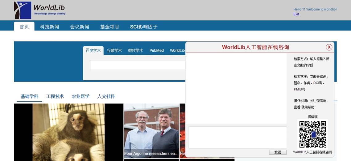 worldlib人工智能在线咨询是一款以网页和微信为载体,运用最新网络技术整合多个搜索引擎为广大师生提供外文文献获取的互联网在线服务平台。该平台支持关键词检索、题名检索(文献准确题名)、文献DOI号检索、文献PMID号检索、图片识别检索、作者检索。查询结果会在10秒内返回,24小时不间断的提供文献查询服务。网页端:http://ai.worldlib.com.cn