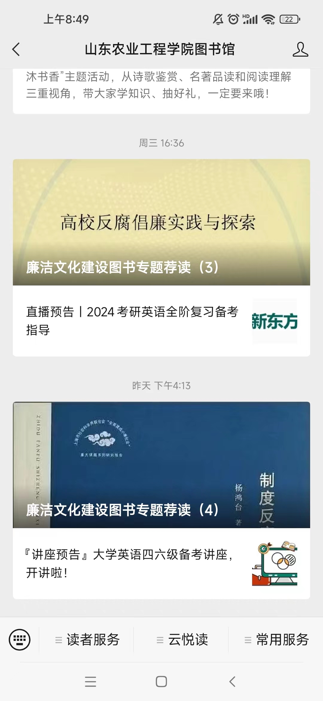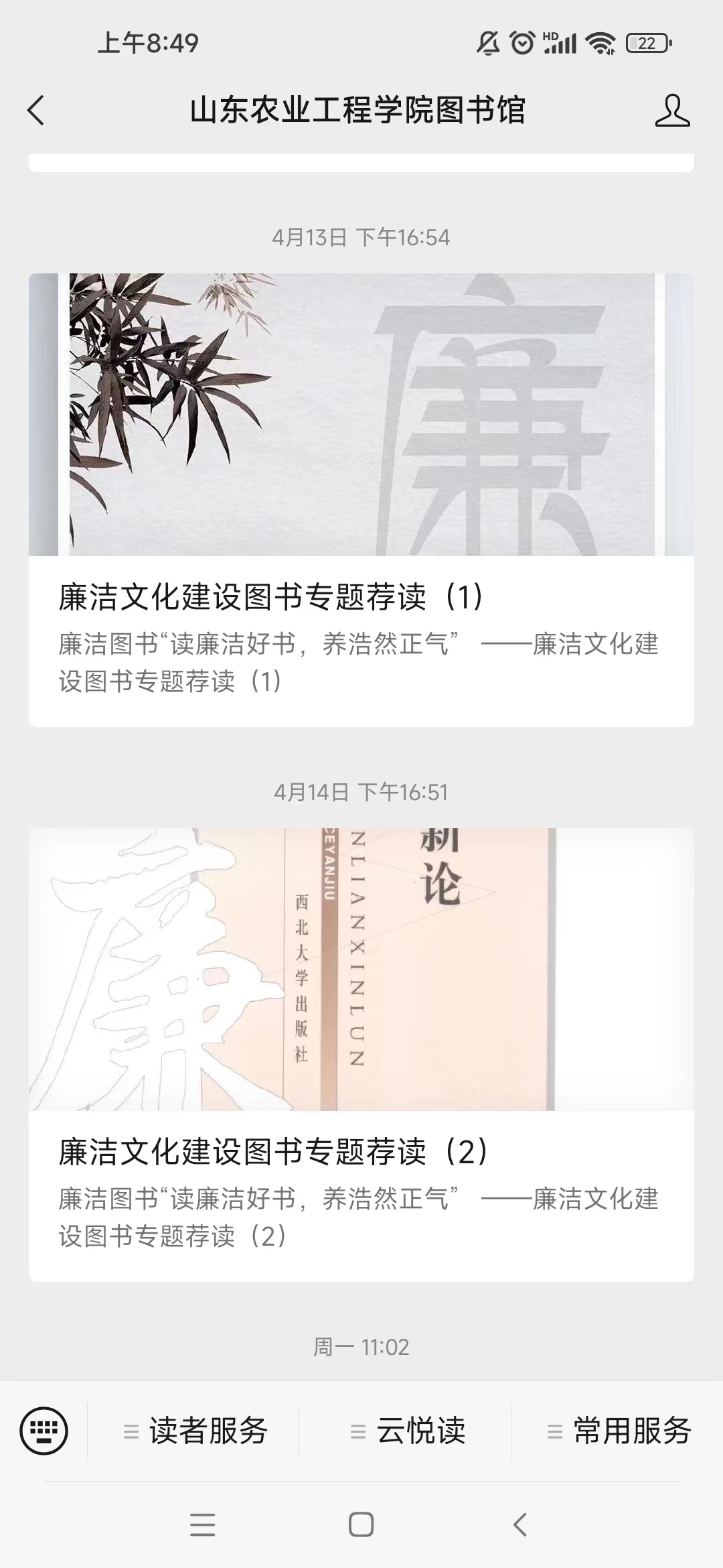 为进一步提升读者的参与度,提高廉洁文化资源的利用率,组织开展“读廉洁好书、养浩然正气”—廉洁文化建设图书专题荐读活动。通过线上线下相结合的方式开展廉洁图书阅读推广活动,线下在馆内设置图书专架,集中摆放廉洁廉政方面图书,方便师生取阅;线上通过微信公众号向全校师生推送廉洁、廉政、道德修养、传统文化等方面电子图书,共进行10期专题阅读推送。读者可扫码阅读,通过“学习通”平台在移动端直接观看。广大师生读者在可阅读中领悟廉洁文化的深刻内涵,从中得到启示、接受教育,进一步提升廉洁自律意识与思想品德修养,助力校园廉洁文化建设。