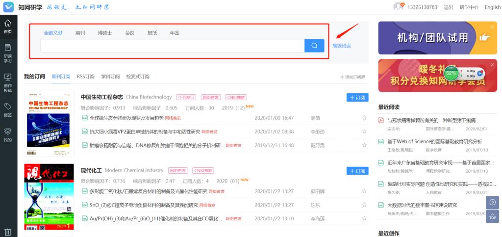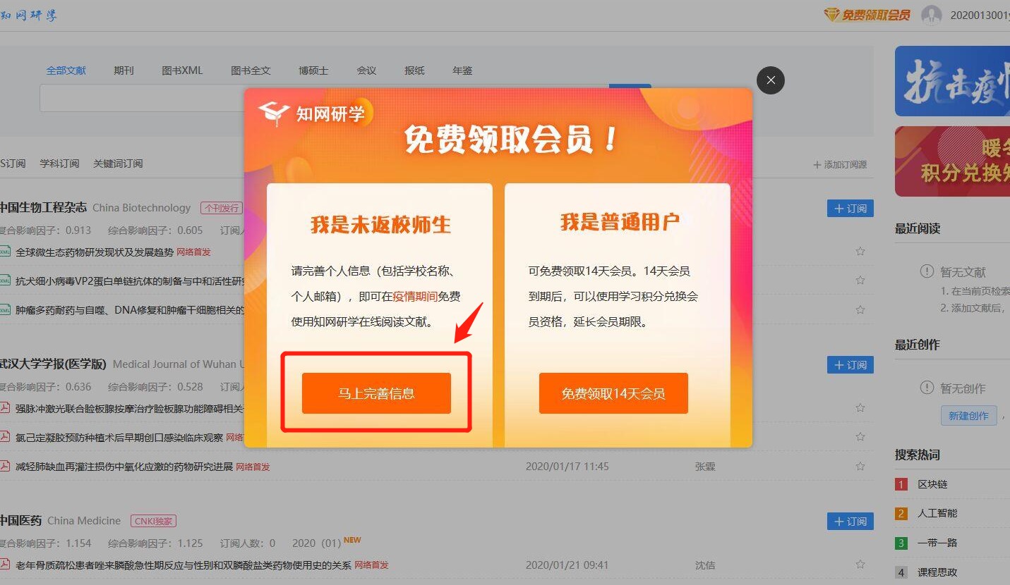研学平台能够为未返校的师生提供免费在线阅读期刊、学位论文、会议论文和年鉴等学术资源,以及智能检索、整刊浏览、HTML阅读、个人学术成果注册等功能。操作步骤如下:
