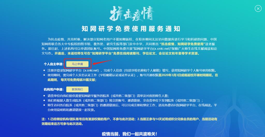 登陆网址x.cnki.net,如下图所示,个人用户点击“马上申请”进行注册。