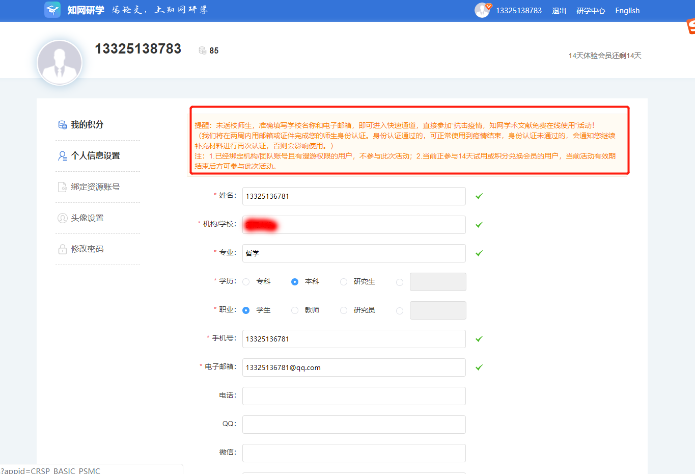 退出APP重新登录,会显示学校名字,即完成关联。至此,您就可尽情享用图书馆为您订购的知网资源了,每人每日在线下载全文数量上限20篇。