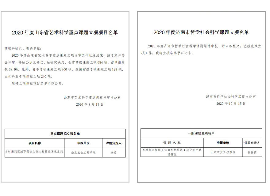 近期,我院程晋南老师申报的 2020年度济南市哲学社会科学课题—“乡村振兴视域下济南乡村旅游差异化开发路径研究”,获得济南市哲学社会科学工作办公室立项;李芹老师申报的2020年度山东省艺术科学重点课题—“乡村振兴视域下历史文化名村镇差异化复兴研究”,获得山东省艺术科学重点课题评审办公室立项。