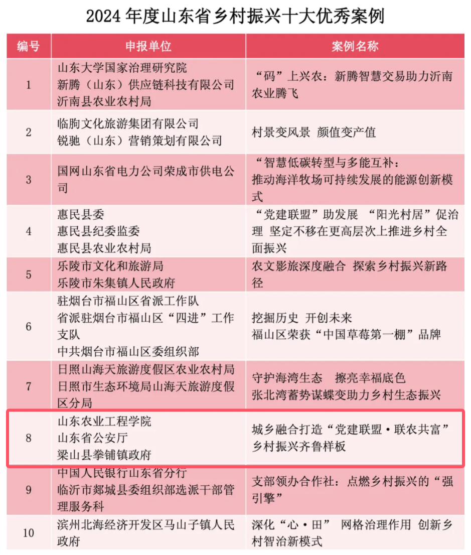 近日,由山东省农业农村厅(山东省乡村振兴局)、山东社会科学院指导,山东省乡村振兴研究会主办,山东大学经济学院、山东社会科学院农村发展研究所、山东广播电视台农科频道承办的2024年度山东省“乡村振兴优秀案例”评选活动公布了获奖结果。必赢乡村振兴研究院联合山东省公安厅、梁山县拳铺镇政府共同申报的《城乡融合打造“党建联盟·联农共富”乡村振兴齐鲁样板》案例,以突出的实践成果、创新的工作模式和可推广的经验,从800余个申报案例中脱颖而出,荣获2024年度山东省“乡村振兴十大优秀案例”之一。
